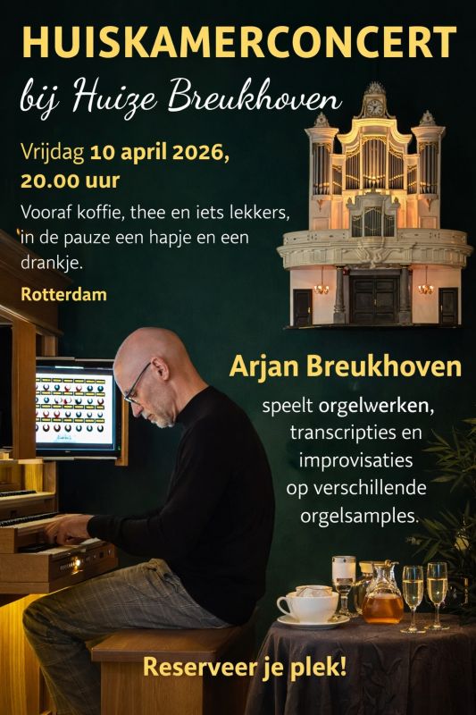 "Al weer bijna 10 jaar mag ik huiskamerconcerten organiseren thuis in Rotterdam. Op vrijdag 10 april is het weer zover! Dan staa mijn deuren weer open voor u als concertbezoeker. Uniek om van zo dichtbij een concert mee te maken! Een beperkt aantal zitplaatsen zijn beschikbaar, dus weer er snel bij!