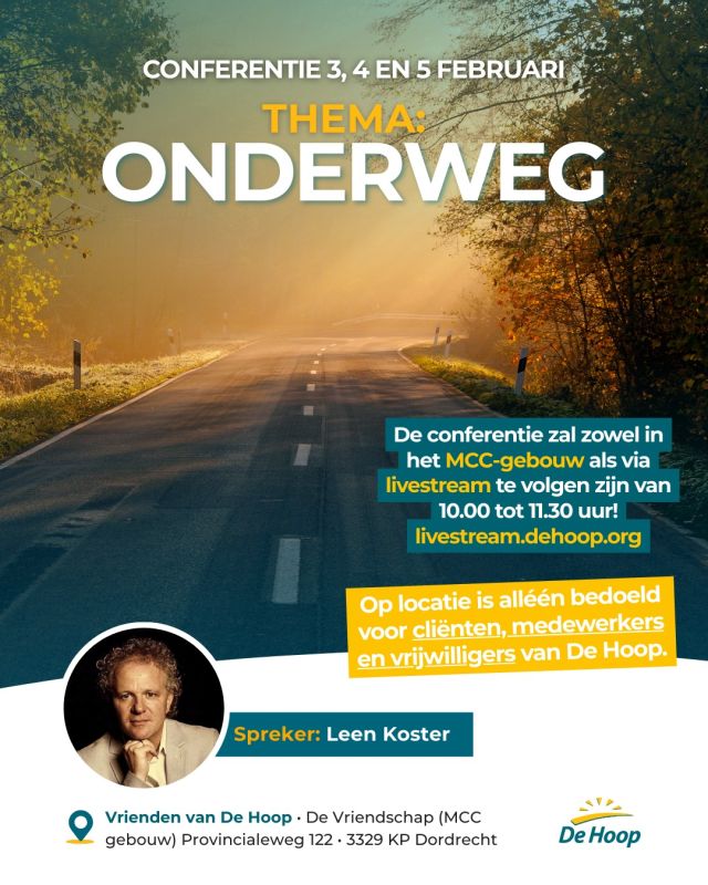 Leen Koster, voorganger van de Volle Evangelie gemeente Het Kruispunt in Nieuwerkerk, spreekt op 3 februari bij Stichting De Hoop. Die volgende week hun eerste conferentie van dit jaar organiseren. De conferentie duurt 3 dagen en start om 10:00 uur en duurt 1,5 uur. Het programma is afwisselend opgebouwd. Iedere ochtend wordt een ander deel van het thema belicht. Elke ochtend zijn er twee korte kernachtige lezingen, muzikale onderbrekingen en boeiende tafelgesprekken. Als kijker kun je reageren via live-chat, app en e-mail.