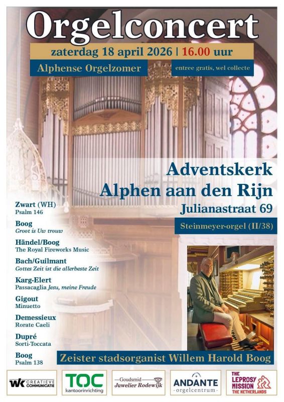 Orgelconcert Adventskerk in Alphen aan den Rijn tijdens de Alphense Orgelzomer 2026 door Zeister stadsorganist Willem Harold Boog op zaterdagmiddag 18 april om 16.00 uur.