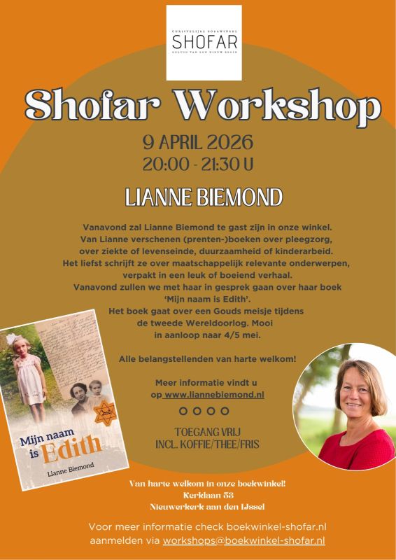 Op donderdagavond 9 april van 20:00-21:30 uur verzorgt Christelijke boekwinkel Shofar te Nieuwerkerk aan den IJssel een interessante workshop. Dit keer is schrijfster Lianne Biemond te gast. Ze komt vertellen en praten over haar boek 'Mijn naam is Edith'. Een verhaal van een joods meisje uit Gouda in de Tweede Wereldoorlog. Toegang is vrij en incl. koffie/thee/fris/.