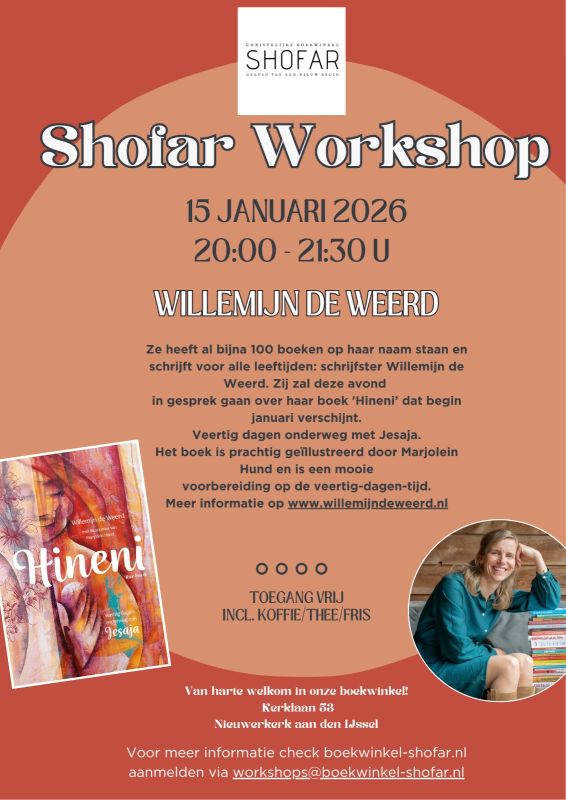 Op donderdagavond 15 januari van 20:00-21:30 is er weer een workshop bij Christelijke boekwinkel Shofar aan de Kerklaan 53 in Nieuwerkerk a/d IJssel. Dit keer zal schrijfster Willemijn de Weerd met ons in gesprek gaan over haar boek 'Hineni' dat begin januari verschijnt. Toegang vrij en incl. koffie/thee/fris. Aanmelden via [email protected]