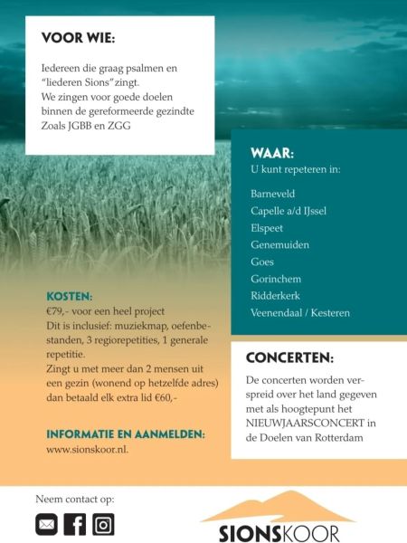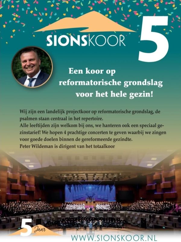 Het Sionskoor is een landelijk projectkoor op reformatorische grondslag dat haar eerste project gehad heeft in 2022. Door de positieve ervaringen van zowel koorleden als werkgroep, is besloten om met het Sionskoor door te gaan. Het vijfde project start D.V. voorjaar 2026. Aanmelden voor Sionskoor 5 is mogelijk via de website van Peter Wildeman of door te klikken op de button onder aan Het Sionskoor – Iedereen die graag psalmen en “liederen Sions” zingt. Het totaalkoor staat onder leiding van dirigent Peter Wildeman.
