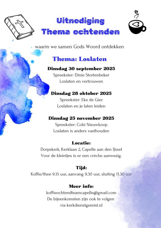 Op 28 oktober a.s. is er weer een thema ochtend in de Dorpskerk Capelle aan den IJssel met het thema "Loslaten en je laten leiden" met Eke de Gier.