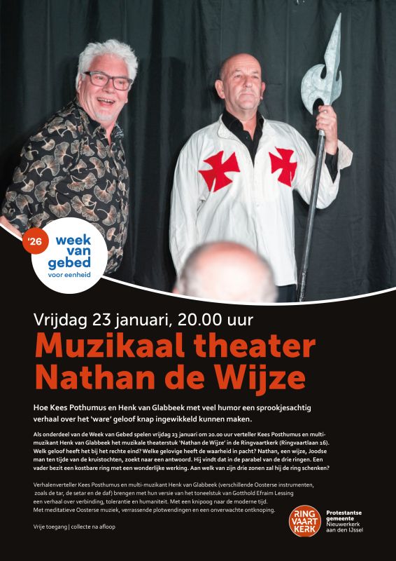 Als onderdeel van de Week van Gebed spelen vrijdag 23 januari om 20.00 uur verteller Kees Posthumus en multi-muzikant Henk van Glabbeek het muzikale theaterstuk ‘Nathan de Wijze’ in de Ringvaartkerk (Ringvaartlaan 16). Welk geloof heeft het bij het rechte eind? Welke gelovige heeft de waarheid in pacht? Nathan, een wijze, Joodse man ten tijde van de kruistochten, zoekt naar een antwoord. Hij vindt dat in de parabel van de drie ringen. Een vader bezit een kostbare ring met een wonderlijke werking. Aan welk van zijn drie zonen zal hij de ring schenken?